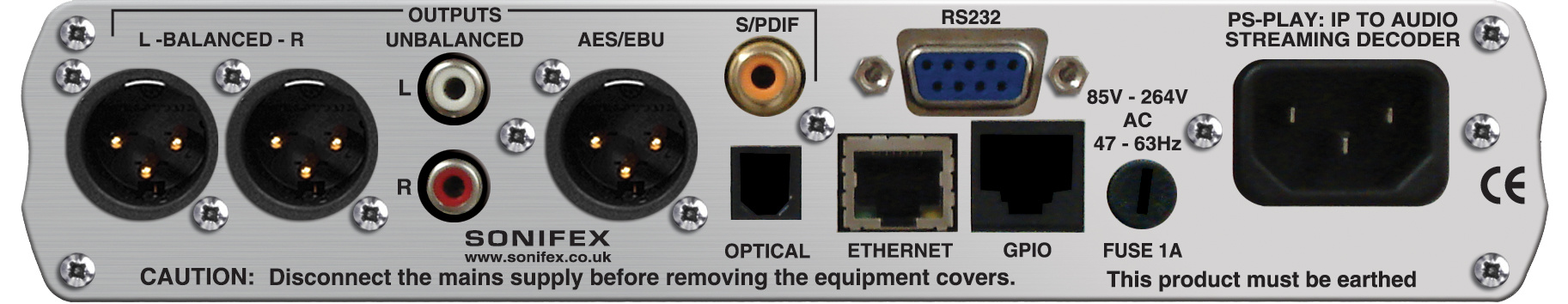 The PS-PLAY is a freestanding IP to audio converter which is also available in a 1U rack-mount as the PS-PLAYS. It takes an IP audio feed and converts it to a number of simultaneous stereo outputs: balanced and unbalanced analogue audio, AES/EBU, S/PDIF & TOSlink digital audio outputs.