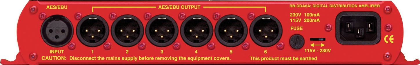The RB-DDA6A digital distribution amplifier is used for distributing digital audio data in AES/EBU format, repeating both the audio data and the status information of the input whilst re-normalising to standard digital audio levels.It has a single XLR-3 female AES/EBU audio input which is distributed to 6 XLR-3 male AES/EBU outputs.