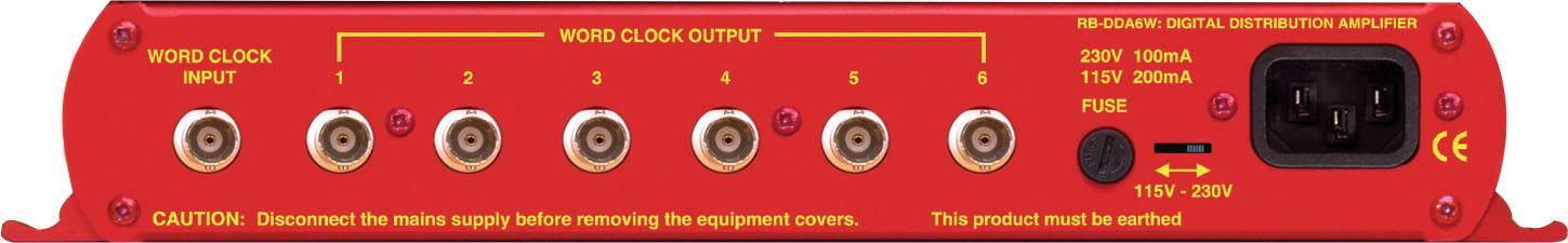The RB-DDA6W word clock distribution amplifier distributes a word clock BNC input signal to 6 word clock BNC outputs re-conditioned. It is used to distribute reference clocks for digital audio systems.