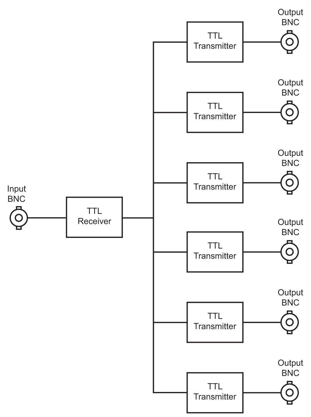 It has a single female BNC audio input which is distributed to 6 female BNC outputs. The units primary application is to distribute a master TTL word clock source to multiple pieces of equipment that need to be synchronised from the master.