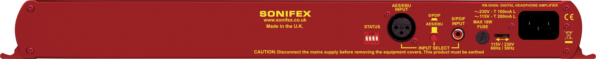 The input connectors consist of a single balanced XLR-3 for the AES/EBU input and a single unbalanced phono connector for the S/PDIF input. A button located on the rear panel is used to select either the AES/EBU, or S/PDIF, input and de-emphasis on the output can be controlled via dipswitch. If de-emphasis is selected, the RB-DHD6 will decode 50/15µs emphasis when indicated by certain channel status bits in the incoming digital audio data. When operating, the front panel power LED flashes red and amber whenever the unit is not synchronised to the incoming digital signal.
