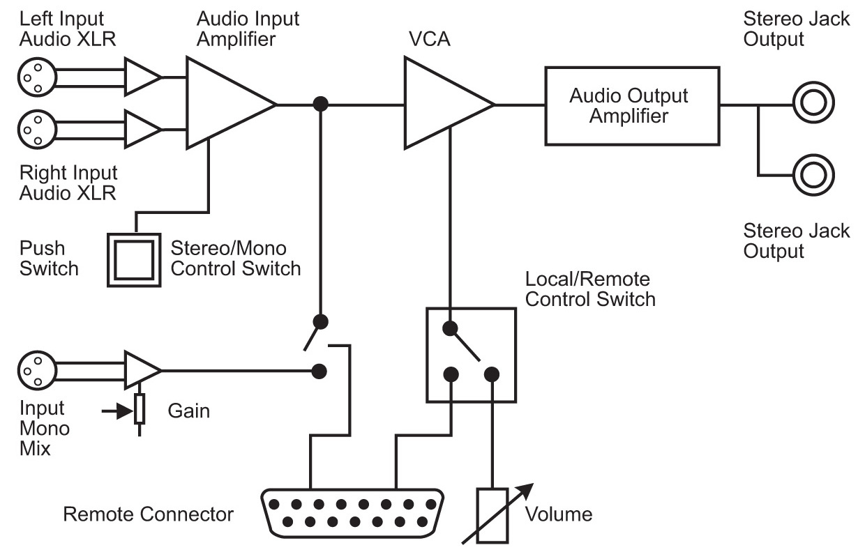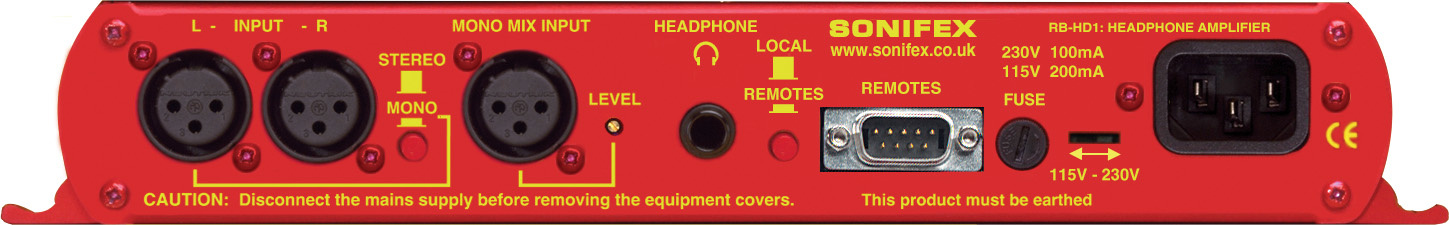 A mono input can be mixed into the main headphone feed, for example, for mixing in talkback to the headphones. This has an input level control via a recessed adjustable potentiometer. The mono mix input can also be controlled remotely. A stereo/mono switch is recessed on the rear panel to prevent accidental knocking. With mono selected, audio is sent to both left and right ear pieces. A LED power indicator on the front panel displays the power supply connection.