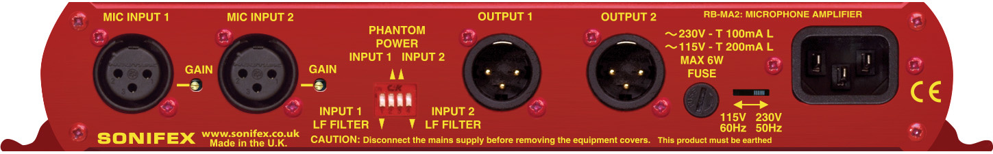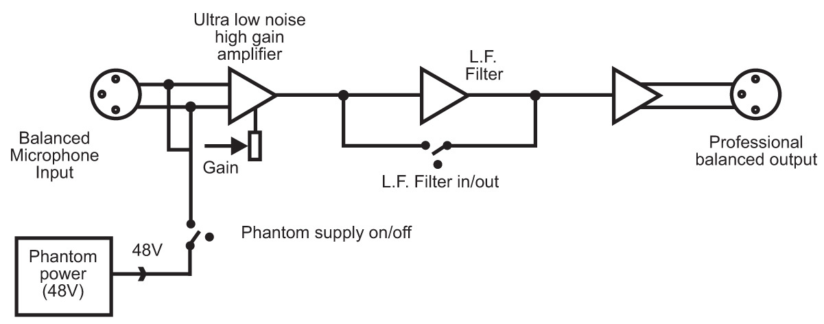 For each channel there are independent switches to control a high pass filter (low frequency roll-off at 125Hz) and to provide phantom power at +48V to the connected microphones.
