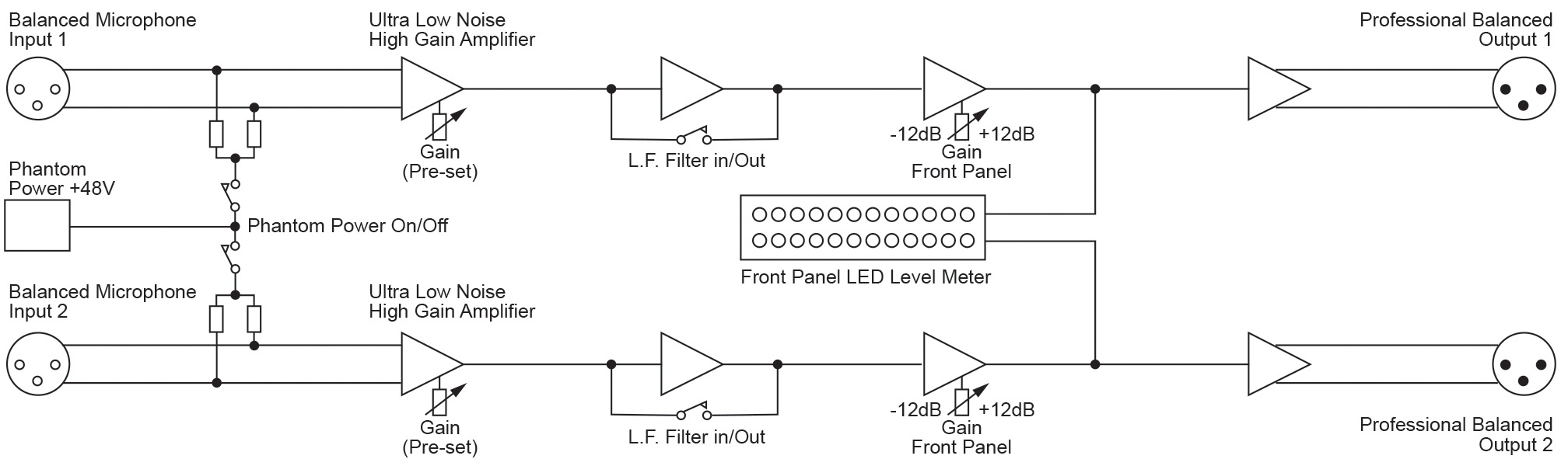 Two front panel potentiometers give ±12dB level adjustment and a 12 segment LED meter shows the audio level for each channel.