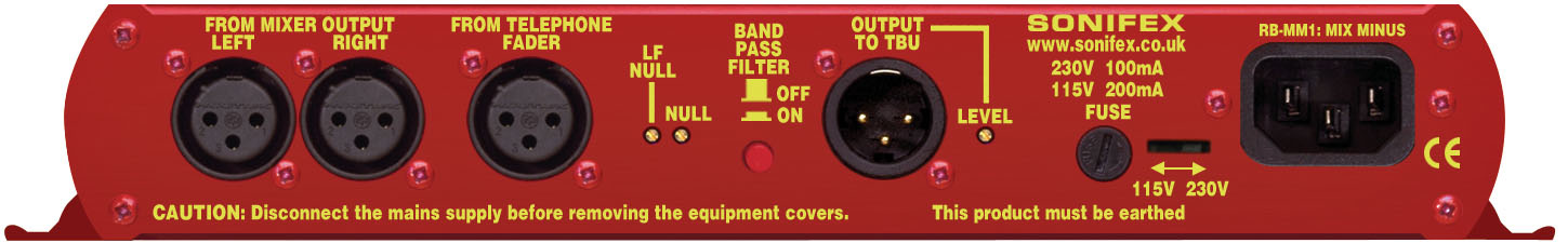Analogue audio inputs and outputs are via Neutrik XLR connectors. The output level to the TBU can be adjusted using a rear panel pre-set potentiometer. To control the cancellation null (the amount of the telephone channel which is subtracted from the mixer output signal), 2 multi-turn potentiometers are provided, one for the LF null and the other for the full-band null. Additionally, a band pass filter can be switched in and out, via a rear panel switch, to condition the signal for the telephone hybrid. To use the RB-MM1 unit with full-band ISDN codecs, the band pass filter can be switched out. For stereo codecs, or conference calls, multiple RB-MM1 units can be used.