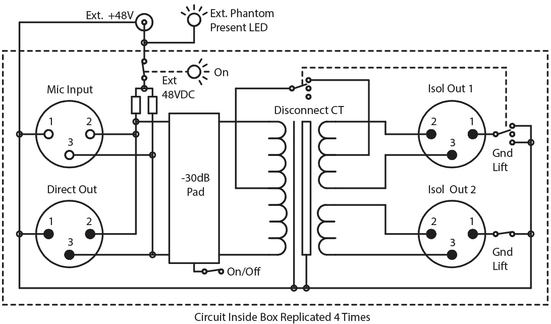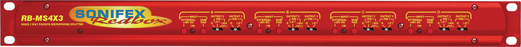 The RB-MS4X3 uses high quality audio transformers that are capable of accepting input levels of up to +18dBu, making the splitter useful in both microphone and line level splitting applications. A 30dB pad can be applied to the input, allowing a line level signal to be interfaced into a microphone input with suitable levels and the correct termination.