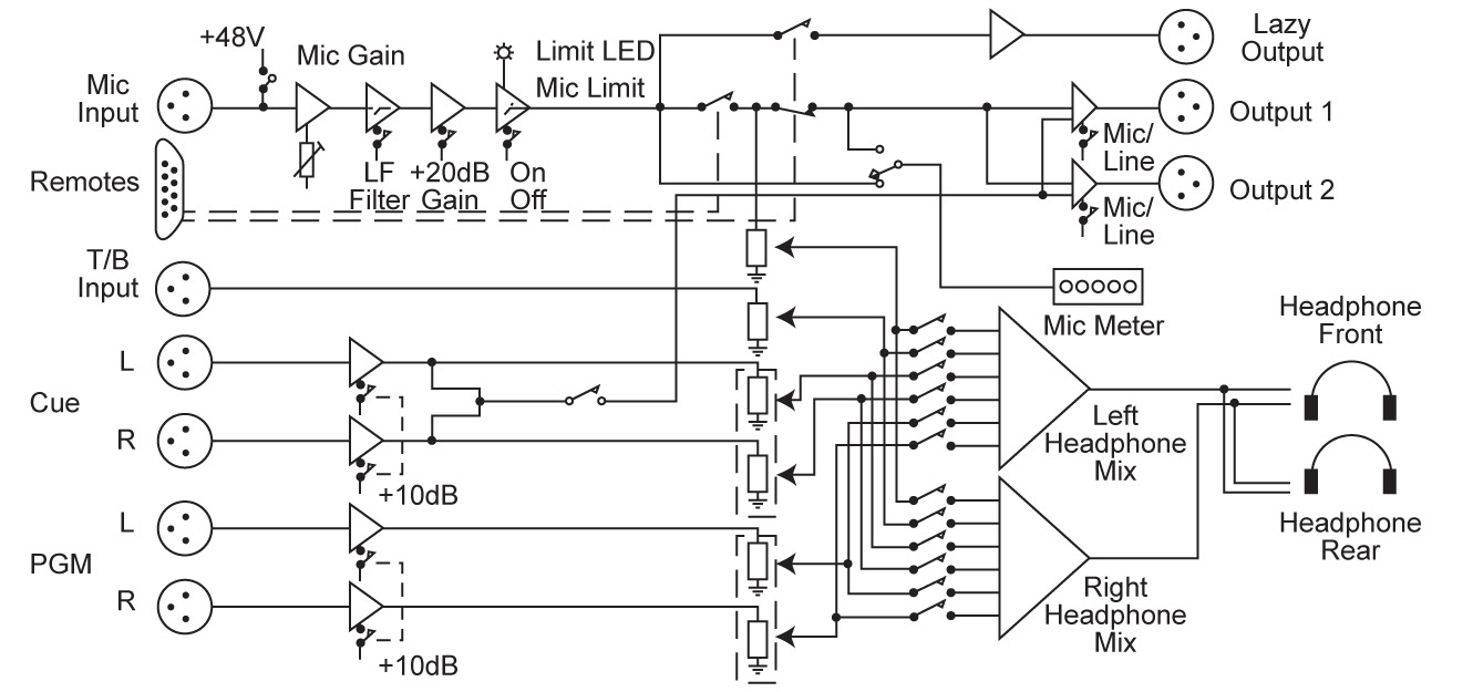 The two main outputs can be independently switched to be at "Line" or "Mic" level outputs using rear panel push switches. Setting the output to a microphone level allows the unit to be inserted into the microphone channel of a mixer. There is an option to permanently enable the MIC button, even when remotely controlled, for occasions when you always want the MIC channel left open. Additionally, there is an option to mix the CUE input as a mono feed to the outputs permanently.