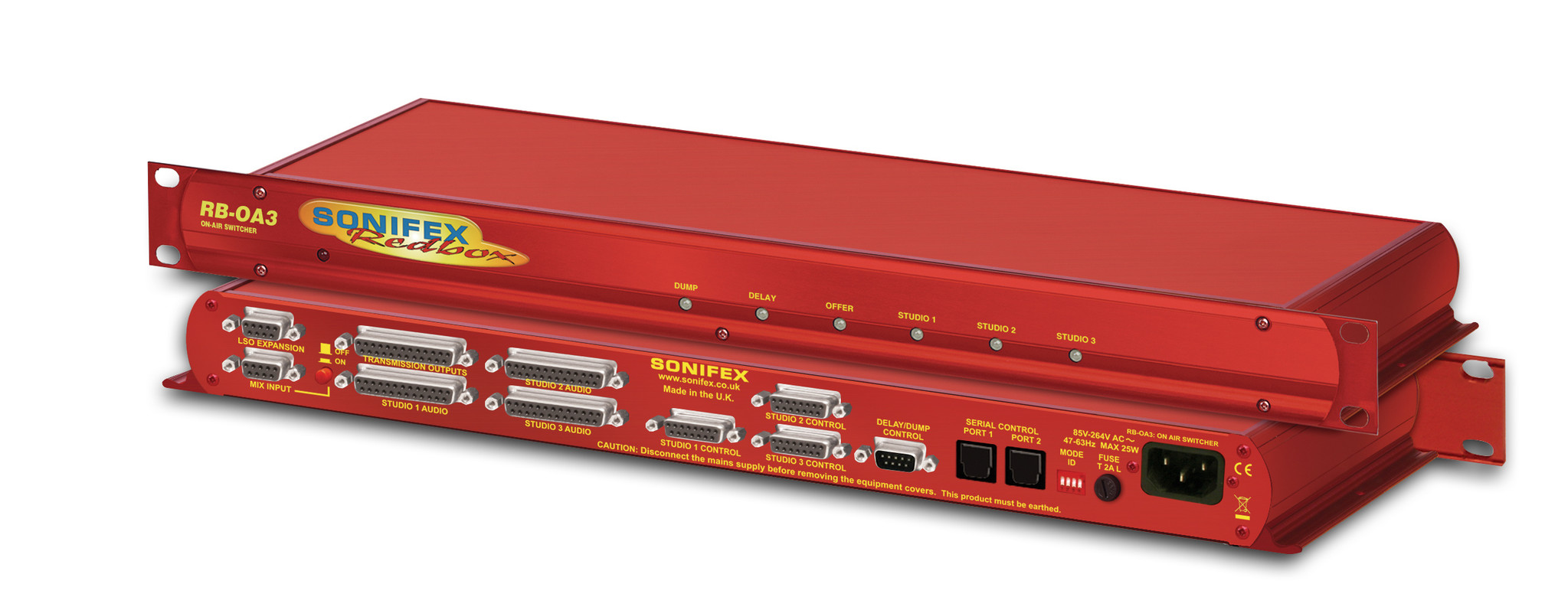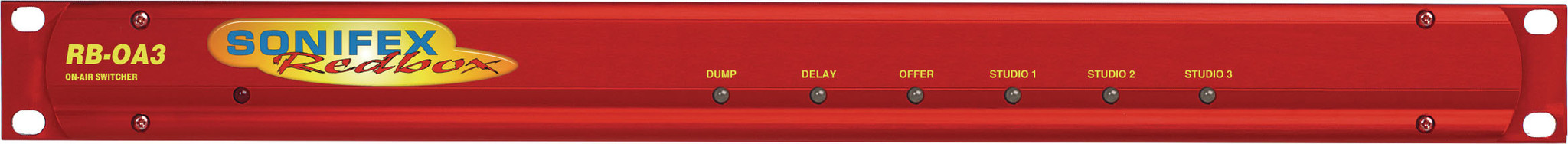 The RB-OA3 is a 1U rack-mount, unity gain on-air switcher, capable of switching three stereo pairs between three studios. Each studio can control the transmission path together with two peripheral paths for equipment such as a codec or hybrid and there is also a "Last studio to offer" bus, allowing for seamless and continuous broadcast from any multi-studio radio network. A "sustain" mode allows for a sustaining system, such as a PC automation system, to control the broadcast. Multiple RB-OA3 units can be connected together to switch more studios or more stereo pairs.