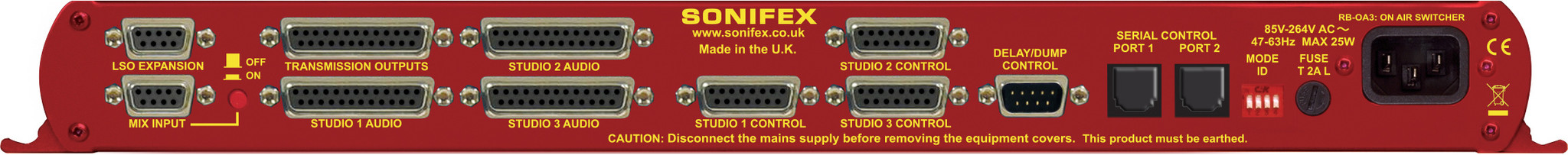 All studios are connected using 25 way D-types for electronically balanced audio signals and control is achieved using 15 way D-types, connecting to an external control unit such as the Sonifex S2-MTBS mixer control panel. A transmission mix connection is included to mix audio which is generic to all studios into the transmission path. This could be used for jingles or adverts for example. The RB-OA3 also allows for the control of a profanity delay to be shared by all connected studios.