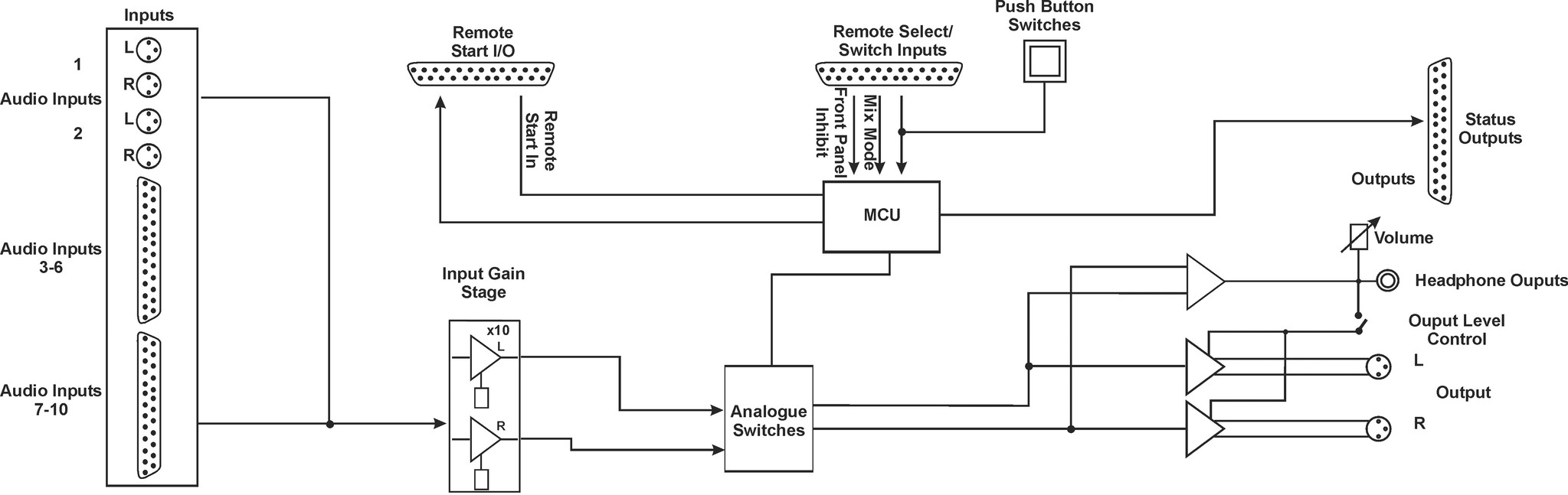 The gain for left and right inputs can be individually adjusted by using the pre-set potentiometers on the front panel. As well as routing the selected audio signal, the unit will also route a remote signal input through the remote connector to the selected input source, for starting external audio equipment such as a CD player.