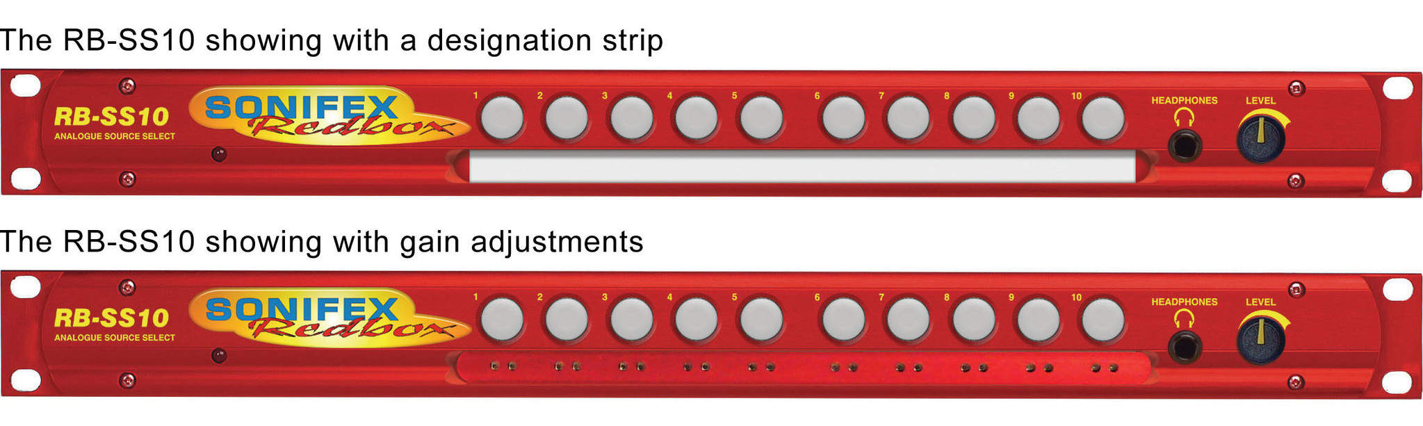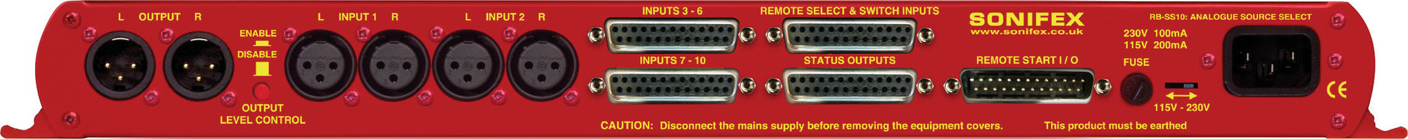 The RB-SS10 10 way stereo analogue source selector/mixer is a 1U rack-mount unit that produces a stereo analogue audio output from 10 selectable stereo analogue sources. There are 10 illuminated front panel push-buttons, which select and indicate the current channel selection. The selection and indication is also available through a remote connector on the rear panel. To stop accidental front panel selection there is a remote input to inhibit the front panel buttons.