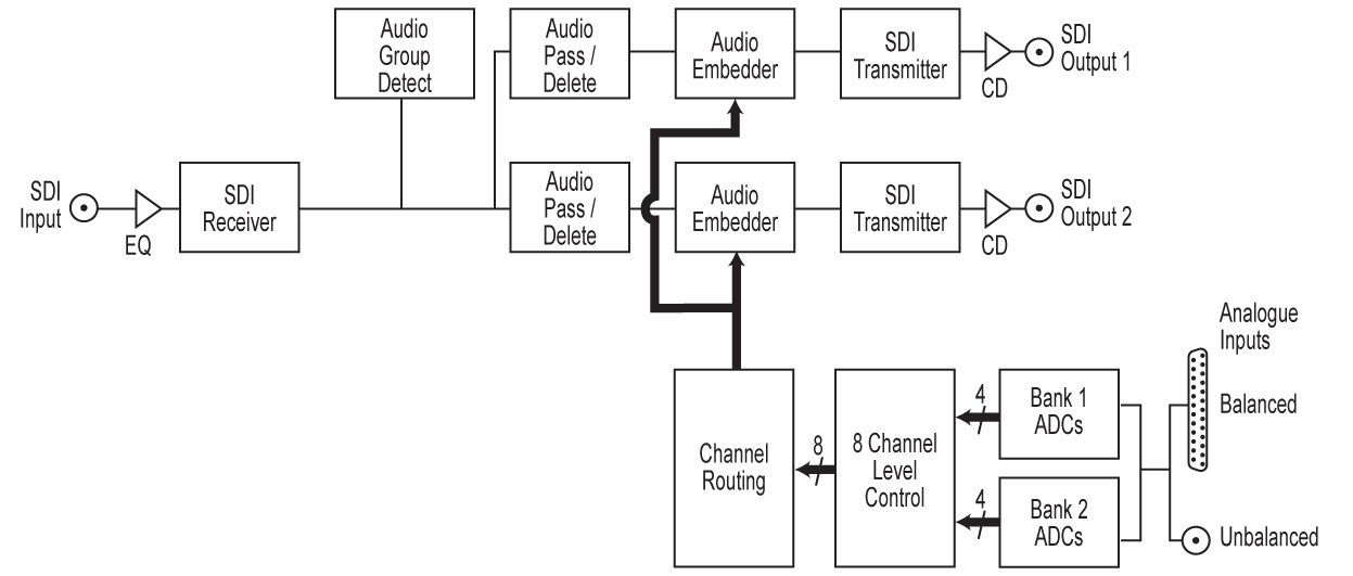 The embedding channel routing is controlled via the front panel buttons and indicators.  There is also LED indication for SDI input status and audio group presence.